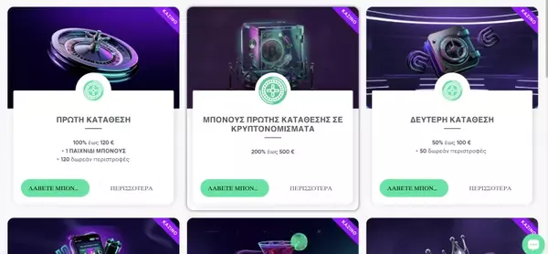Το πακέτο καλωσορίσματος του καζίνο μας χωρίζεται σε καταθέσεις, ώστε να το διεκδικείτε βήμα-βήμα. 1η Κατάθεση: 100% έως €120 + 120 Free Spins. 2η Κατάθεση: 50% έως €1,000 + 50 Free Spins. Η ελάχιστη κατάθεση είναι €20 και η απαίτηση τζίρου είναι 40x στο ποσό του μπόνους.