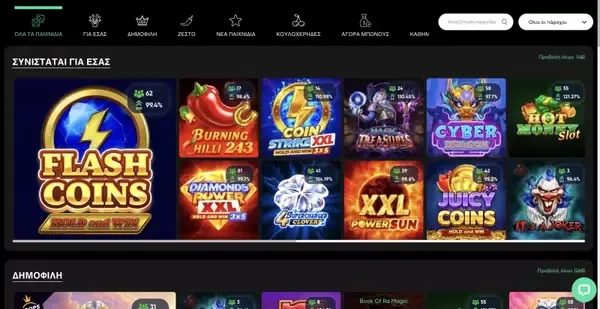 Το lobby του καζίνο μας περιλαμβάνει 12.000 παιχνίδια σε βασικές κατηγορίες, με φίλτρα που σας βοηθούν να βρίσκετε γρήγορα αυτό που θέλετε. Συνεργαζόμαστε με παρόχους όπως Pragmatic Play, Play’n GO, NetEnt, Yggdrasil, Evolution, Playtech, Ezugi, Vivo Gaming, Lucky Streak και BGaming. Θα βλέπετε το RTP για κάθε παιχνίδι και ο μέσος όρος RTP της πλατφόρμας μας είναι 95%.